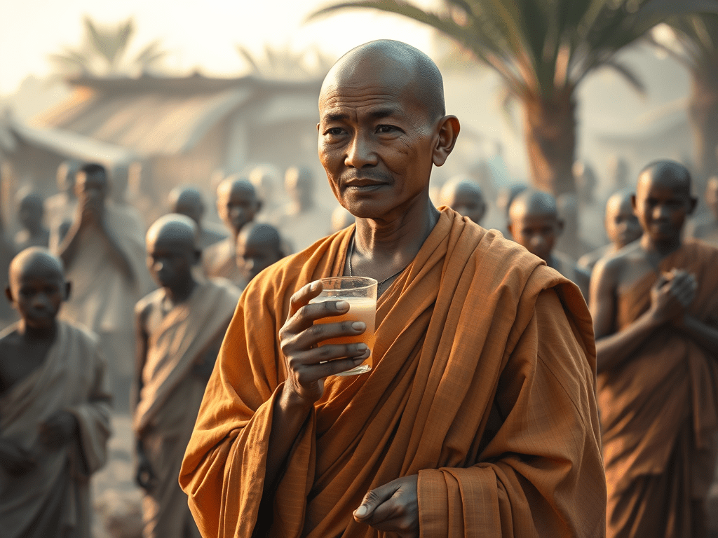 -Manjushree: Accadde qualcosa di sorprendente e impensato: il monaco ubriacone smise improvvisamente di bere. Nel clima generale di sconforto seppe affrontare la situazione come nessun altro. Si prese cura dei malati, condivise il suo cibo, aiutò la comunità a uscire dalla carestia lavorando con energia inesauribile. E in tutto questo continuò la pratica della meditazione, mantenendo una calma degna di un Risvegliato. Tutti erano stupiti e commossi dalla dedizione di quel monaco tanto vilipeso e disprezzato. Intanto il Buddha da lontano osservava lo svolgersi dei fatti. E sorrideva.