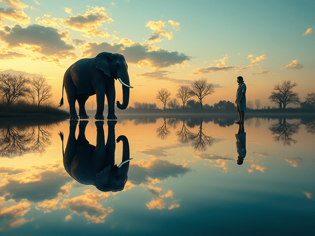 -Maya è sempre in agguato. È quando scambiamo le nostre immagini mentali per la realtà, quando ci aggrappiamo a un’idea ingannevole di ciò che siamo, quando dimentichiamo che ogni cosa è dipendente e in intima connessione con tutte le altre. Il paradosso dell’elefante allora diventa una piccola lezione di saggezza. L’animale vede un’ombra e se ne va; l’uomo invece costruisce un’identità fittizia e la difende per tutta la vita. Forse il primo passo del risveglio consiste proprio in questo: accorgersi che l’“io” a cui siamo così affezionati non è altro che un riflesso sull’acqua. Quando l’acqua si increspa, l’immagine scompare. Ma il fiume dell’esistenza continua a scorrere.